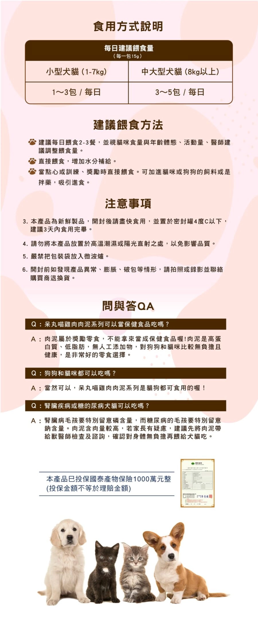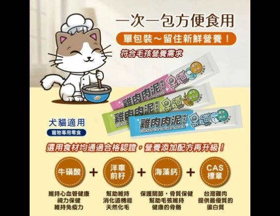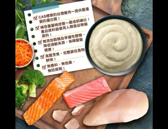 成分:雞肉、雞肝、雞油、胡蘿蔔、花椰菜、蛋黃粉、魚水解蛋白、酵母粉、牛磺酸、洋車前籽、海藻鈣、增稠劑、水